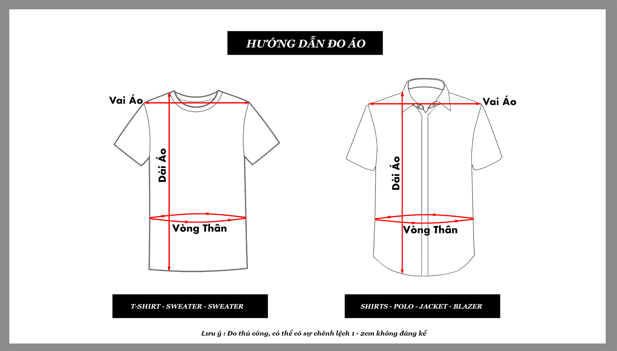 Size XXL: Dài : 78 cm / Vai : 46 cm / Tay : 62 cm/ Vòng Ngực : 102 cm/ Vòng Eo : 98 cm